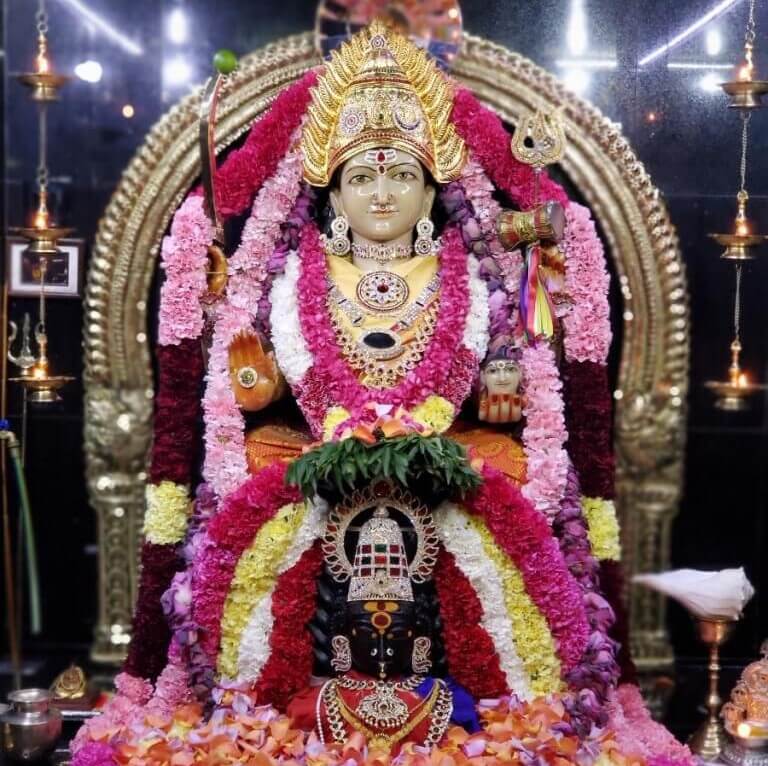 According to Shakta agamas, she is depicted in a sitting posture, flanked sometimes by Subramaniya, Ganesha and Naaga, with Presiding Deity was consecrated, and has been attracting an increasing number of people from the US and all over the world year after year, and has become an important landmark of Florida.